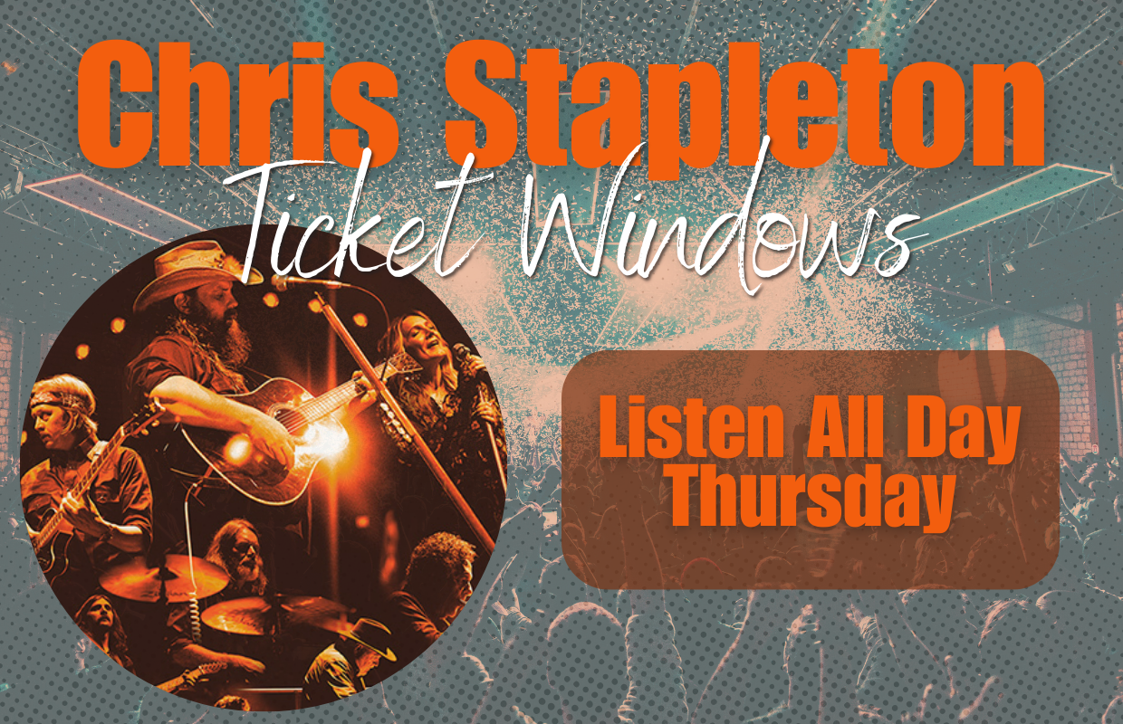 Listen on January 15th from 7am to 7pm, to hear the ticket window sound. When the ticket window sound is played the person that is the 10th caller will win a pair of tickets to see Chris Stapleton at Raymond James Stadium on June 13th. The ticket window will open 10 times throughout the day.