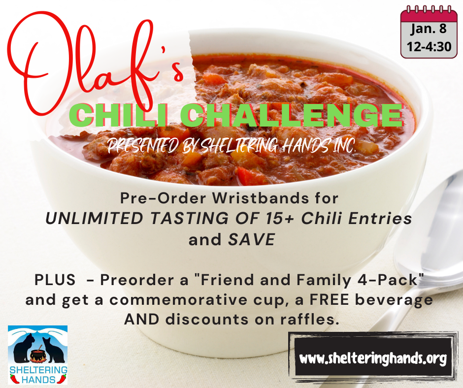 Now is the PURRfect time to PRE-ORDER wristbands for the 3rd Annual Olaf’s Chili Challenge coming up on January 8th, 2022 at the McPherson Complex in Ocala. ![]()