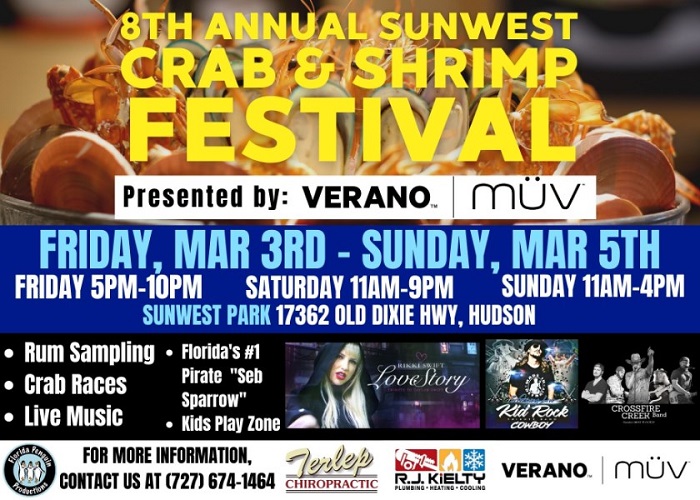 The 2023 SunWest Crab and Shrimp Festival presented by MUV is returning to SunWest Park in Hudson, Florida March 3-5th. Admission to the event includes Award-Winning Live Entertainment, access to 18 different Seafood Chefs & Food Trucks(food not included), rum sampling stations, cocktail bar & domestic beer station for adults, hermit crab races, pirates, and more!