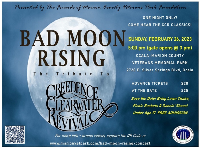 Bad Moon Rising comes to Ocala/Marion County Veterans Memorial Park for a one night only performance! Rock out to all the CREEDENCE CLEARWATER REVIVAL classics on Sunday, February 26, 2023 at 5 pm! Bring your picnic baskets, lawn chairs and dancin’ shoes!