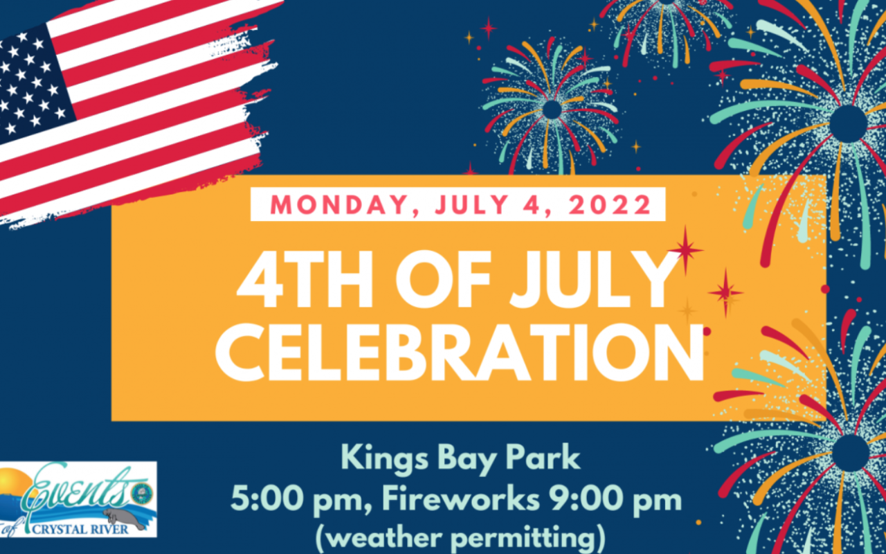 The City celebrates the 4th of July holiday every year with an event at Kings Bay Park and a fireworks display over Kings Bay. Join us for live music, food and drinks, vendors, and fun in downtown Crystal River. Fireworks over Kings Bay at 9:00 pm, weather permitting. The show can be viewed from our waterfront areas around Kings Bay but the best location to view the show from land is Kings Bay Park. This is a rain or shine event. Fireworks may be delayed or moved up slightly due to weather.