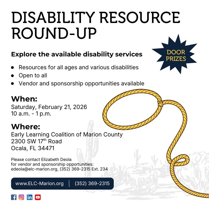 Explore the available disability services at the Disability Resource Round-Up event on Saturday, February 21, 2026, rom 10:00 a.m. to 1:00 p.m. The Early Learning Coalition of Marion County is hosting the event that is open to all. Visit with local vendors providing resources for all ages and various disabilities. The event features a kids play area and free screenings. Participate in the scavenger hunt to be eligible to win door prize drawings.