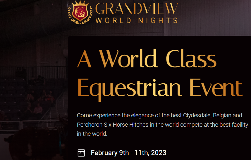 Grandview World Nights will be at the World Equestrian Center, Ocala FL. 3 days of competition of some of the biggest horses in the world. The Clydesdales, Percherons and Belgians will compete for the Florida championship Eight Horse Hitch and more…