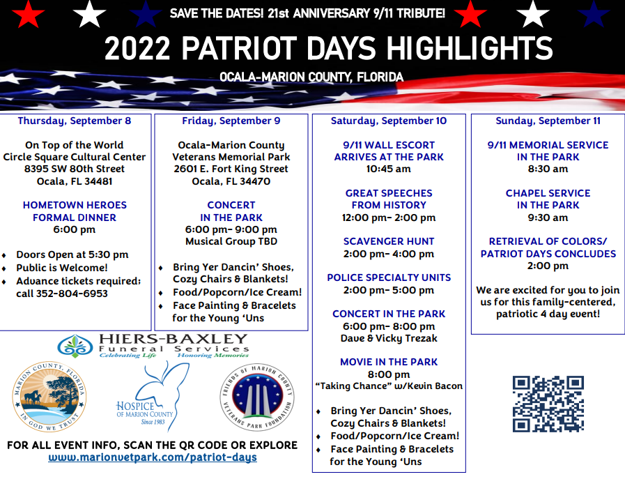 Great Speeches from History 93.7 K COUNTRY When Sep 10th, 2022 12:00pm - 2:00pm Where 1515 NE 3rd StOcalaFL34785 Patriot Days / September 10 – Friends of Marion County Veterans Park Foundation