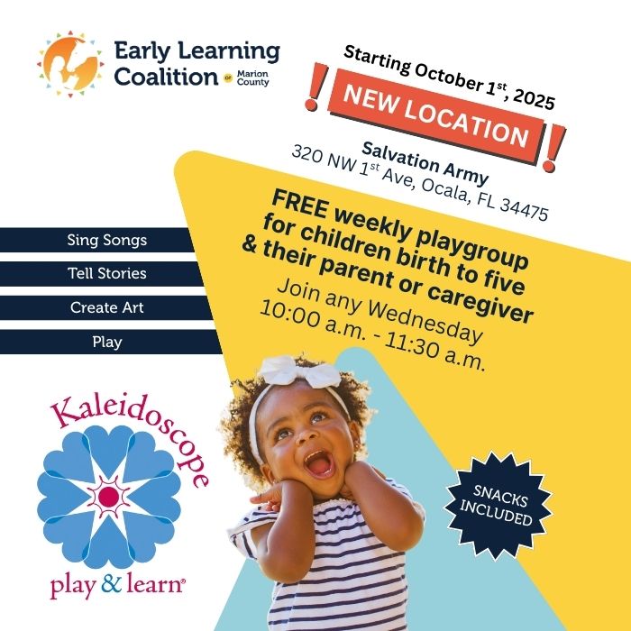Marion County, FL, September 18, 2025: Kaleidoscope Play & Learn weekly playgroup is moving to the Salvation Army Center of Hope, 320 NW 1st Ave, Ocala, on October 1, 2025. Kaleidoscope Play & Learn (KPL) is hosted by the Early Learning Coalition of Marion County and is free for children birth to five and their parent or caregiver. The group meets Wednesdays from 10 a.m. -11:30 a.m., and no registration is required. The move to Salvation Army allows the playgroup to accommodate more families.