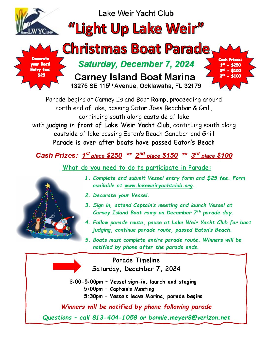 Lake Weir Yacht Club presents the 13th Annual “Light up Lake Weir” Christmas Boat Parade 2024!