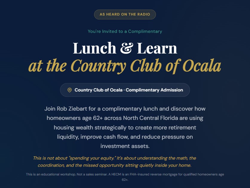 Join Rob Ziebart for a complimentary lunch and discover how homeowners age 62+ across North Central Florida are using housing wealth strategically to create more retirement liquidity, improve cash flow, and reduce pressure on investment assets.