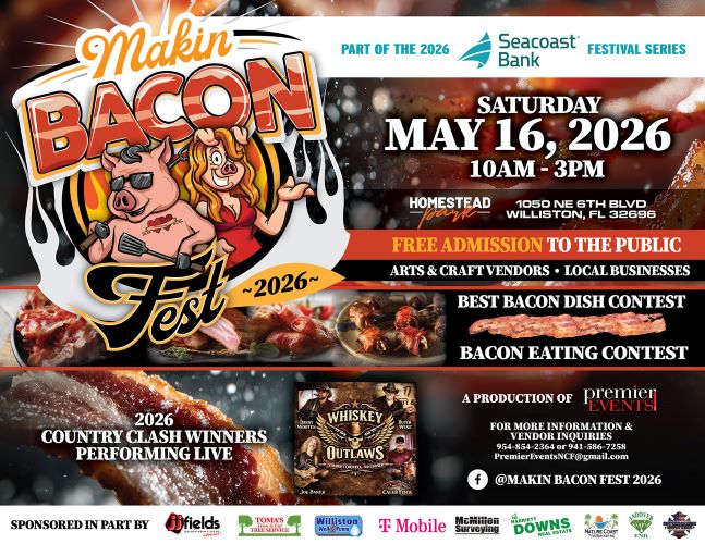 Get ready for the most delicious day of the year as the 6th Annual Makin’ Bacon Fest returns on Saturday, May 16, from 10 AM to 3 PM at Homestead Park (1050 NE 6th Blvd, Williston, Fl 32696)!