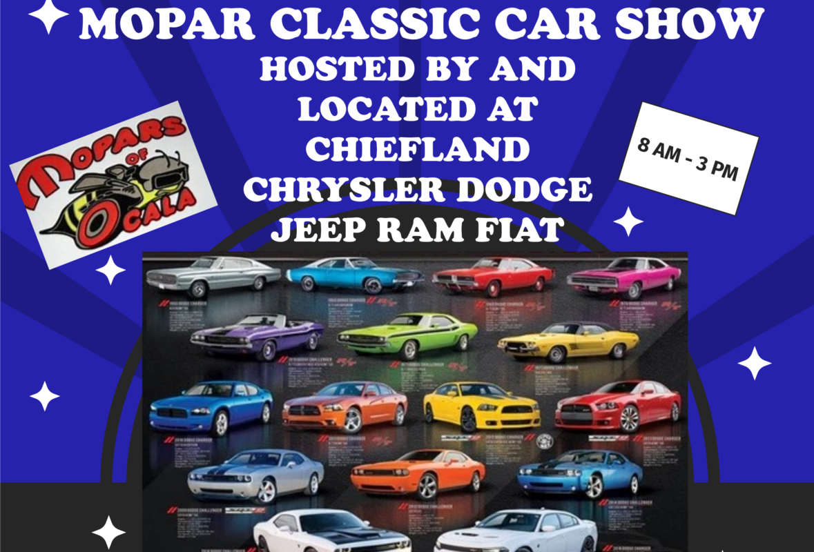 Mopar Classic Car Show hosted by and located at Chiefland Chrysler Dodge Jeep Ram Fiat. To enter your vehicle please call Mopar of Ocala 352-427-8382. Join in for this amazing event, come see the amazing classic cars, local food vendors and shop the local product vendors! In support of Soldiers Freedom Outdoors, healing the hidden wounds of war.