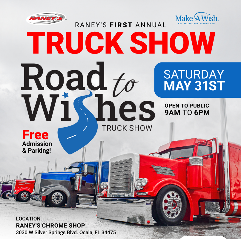 Raney’s is thrilled to announce that on Saturday, May 31, 2025, they will host the first-ever truck show. But this is more than just a truck show—it’s an opportunity to make a profound impact. Partnered with the Make-A-Wish Foundation to turn this event into a powerful fundraiser. The goal is to raise $80,000, which will allow us to grant the heartfelt wishes of eight deserving children. This event is a celebration of our shared passion for the trucking industry, showcasing incredible show trucks and bringing our community together for an unforgettable day. Let’s make this event an incredible success and lay the foundation for a tradition that grows bigger and better each year.