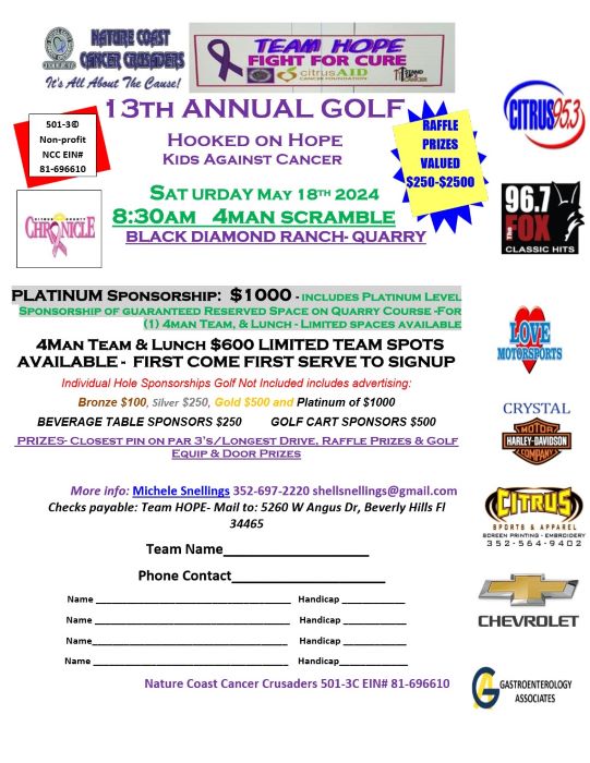 The Team Hope 13th Annual Kids Against Cancer Golf Tournament is May 18th from 8 am – 4 pm at Black Diamond Ranch in Lecanto, FL.