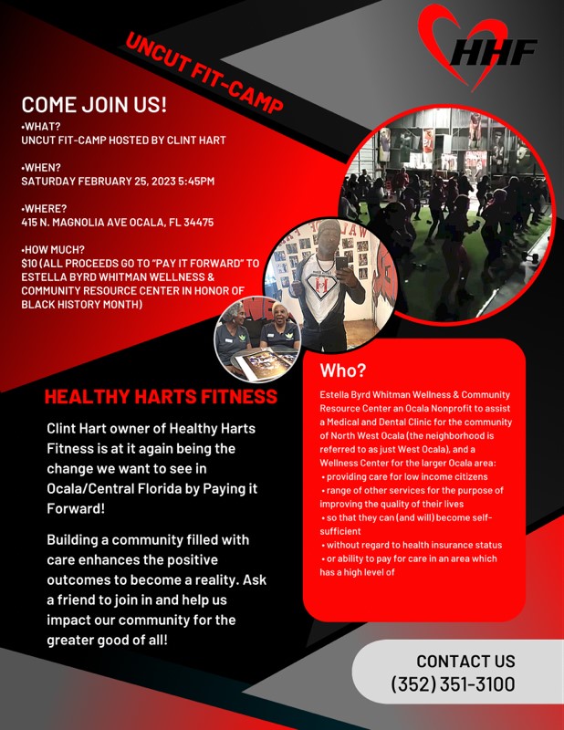 Clint Hart owner of Healthy Hart’s Fitness is at it again being the change we want to see in Ocala/Central Florida by Paying it Forward! Building a community filled with care enhances the positive outcomes to become a reality. Ask a friend to join in and help us impact our community for the greater good of all. Join us on Saturday February 25, 2023 at 5:45pm for only $10. All proceeds go to “Pay It Forward” to Estelle Byrd Whitman Wellness & Community Resource Center in honor of Black History Month.