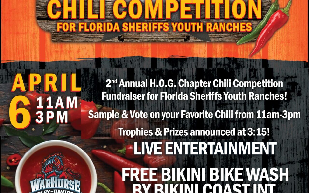 War Horse Harley Davidson Presents the 2nd Annual H.O.G. Chapter Chili Competition for Florida Sheriffs Youth Ranches. Sample and vote on your favorite chili! Trophies and Prizes announced at 3:15! LIVE ENTERTAINMENT AND FREE BIKINI BIKE WASH (By Bikini Coast Int) With cold beer by Kansas City Craft BBQ! To compete or be a sponsor please email marketing@warhorseharley.com as space is limited.