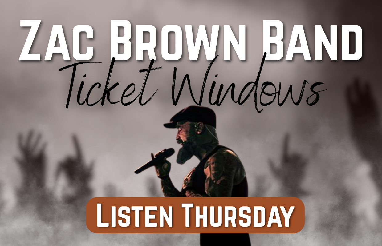 Listen on January 29th from 7am to 5pm, to hear the ticket window sound. When the ticket window sound is played the person that is the 10th caller will win a pair of tickets to see Zac Brown Band at Benchmark International Arena on September 18th. The ticket window will open 5 times throughout the day.